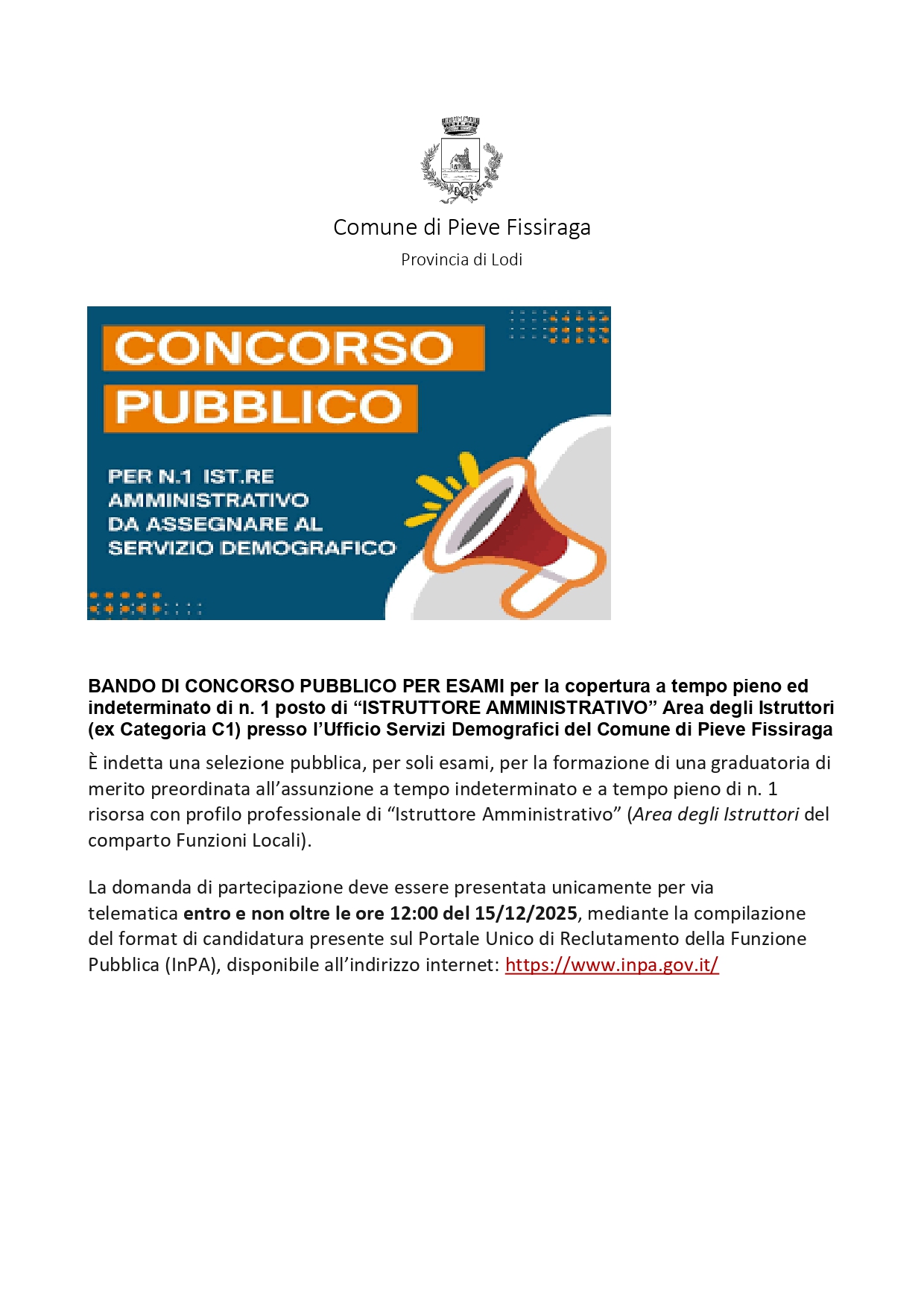 (ex Categoria C1) presso l’Ufficio Servizi Demografici del Comune di Pieve Fissiraga