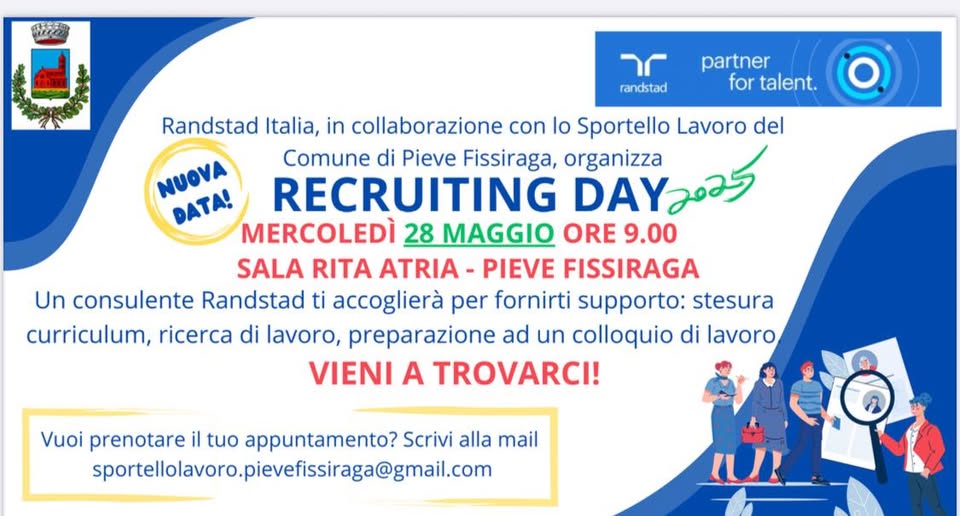 Ranstad Italia, in collaborazione con lo Sportello del Lavoro del Comune di Pieve Fissiraga, organizza presso la sala Rita Atria un "Recruiting Day".