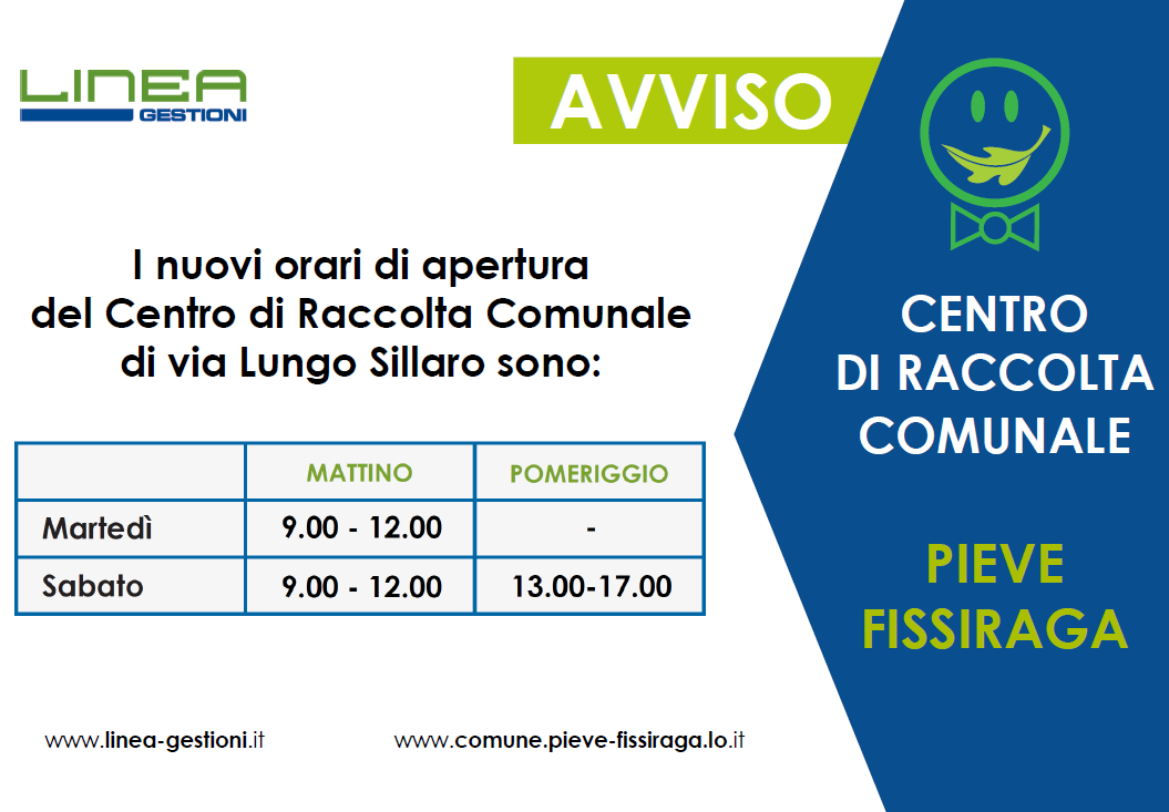 Si avvisa che a partire dal mese di Gennaio 2020 gli orari di apertura della piazzola ecologica saranno modificati come specificato nell'allegato avviso.